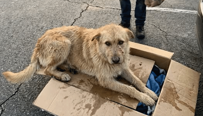 A stray dog lay blocking a torn cardboard box, and no one dared get close until someone finally gathered the courage to open it.