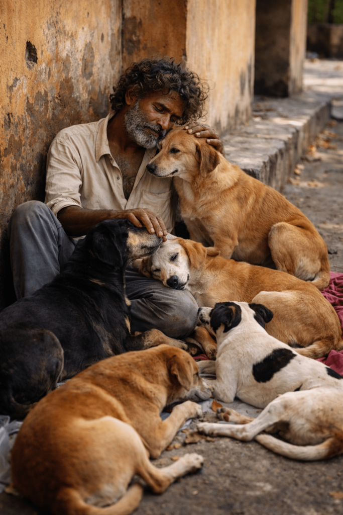 In many cities, homeless people and stray animals exist on the same invisible edge of society. Both are seen and not seen. Both move through public spaces without truly belonging to them. Both learn how quickly the world can look away. It is perhaps no coincidence that these lives so often intersect. A person who knows abandonment may recognize it instantly in an animal. A creature used to being chased away may understand gentleness faster than we expect.