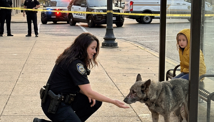 Officer Davila came up behind me, slow, in a low crouch. She had taken off her hat. She had taken off her duty belt — I learned later this was unusual; she did it on instinct. She knelt down beside me. She held out her hand to the dog. Open palm. Down.