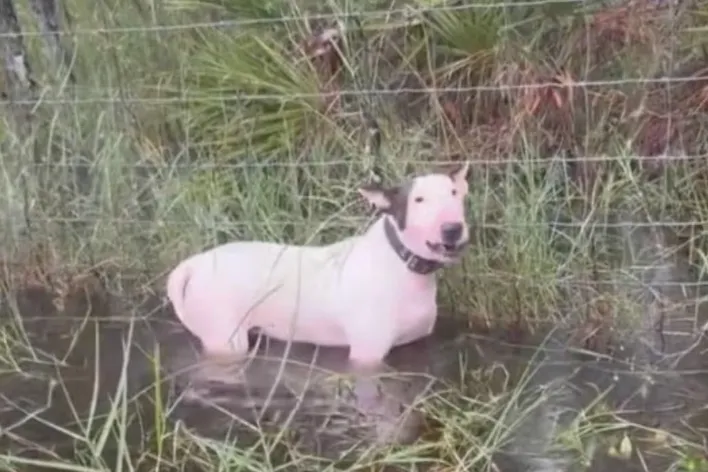 As Hurricane Milton loomed over Florida, claiming the homes of thousands, a heart-wrenching scene unfolded on the side of I-75 in Tampa. On October 9th, 2024, amidst the chaos of over a million Floridians fleeing their homes, Florida Highway Patrol Trooper Orlando Morales made a shocking discovery—a white bull terrier was tethered to a fence, trapped in rising floodwaters, with the storm’s Category 3 winds just hours away.