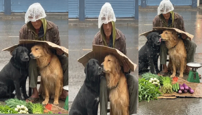 The man, with no sturdy umbrella or proper shelter to protect himself, had only one thing to keep the storm at bay—a piece of cardboard. It was an old and worn sheet, certainly not enough to shield him from the heavy rain. But what made this moment so extraordinary was that he didn’t use it for himself. Instead, he carefully lifted the cardboard and placed it over the two dogs sitting close by his side. They were his companions, his family in a world where he had little else to rely on.