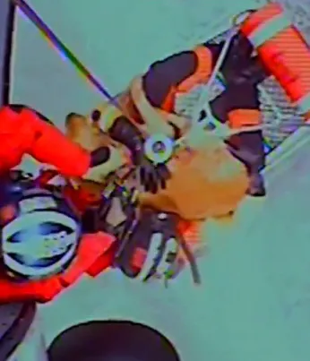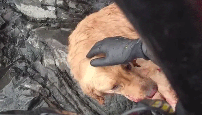 To the rescuers’ surprise, Leo remained still, despite the immense pain he was likely in. His golden fur matted with blood, he allowed the stranger to approach. The swimmer gently lifted Leo and placed him in a hoisting basket, his hands steady as he prepared to pull the dog to safety.